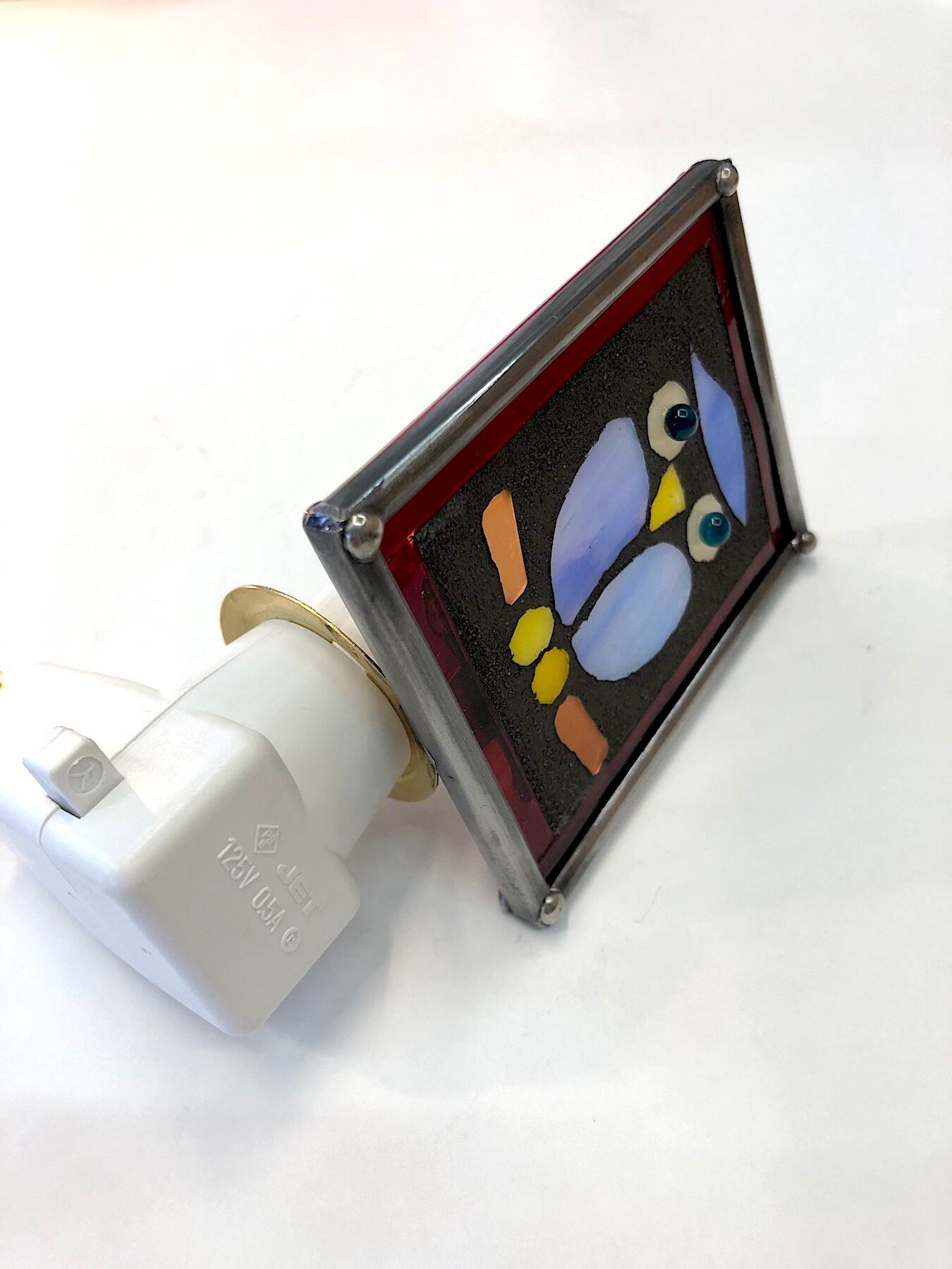 モザイク仕上げのミニランプ。おやすみランプともいいます。吟味したガラスをカットしてわざとまわりを研磨せずそのままモザイク用セメントで固めてあります。そうすることで程よくざらざら感が出るんですね。