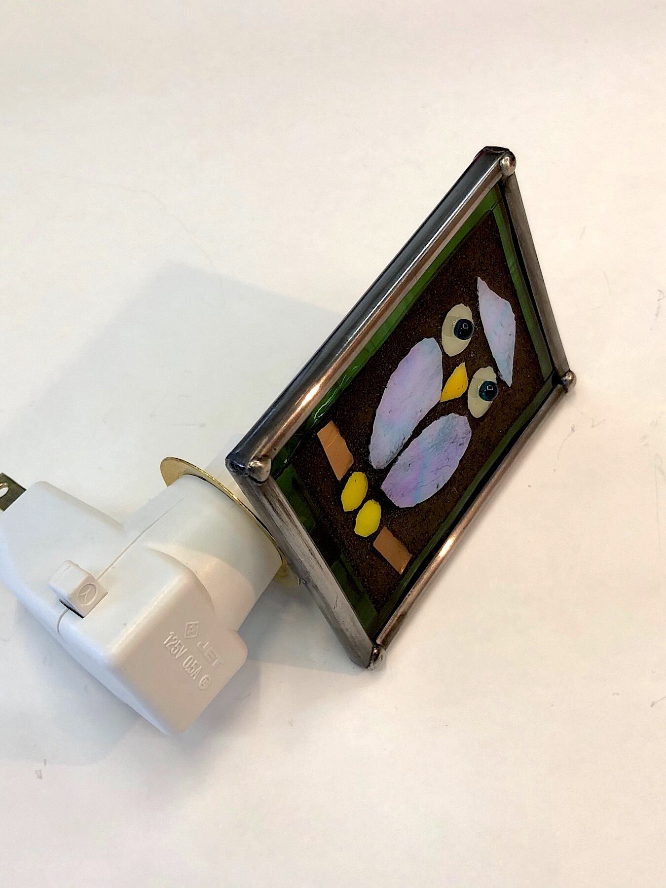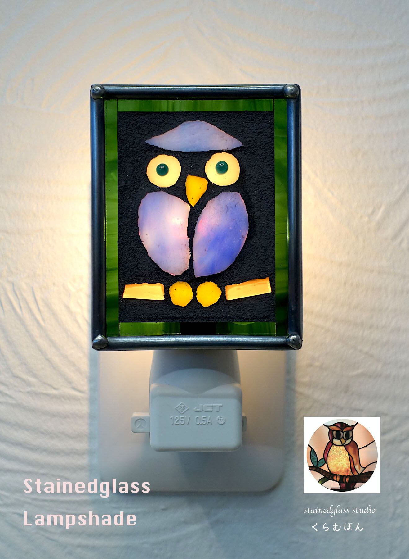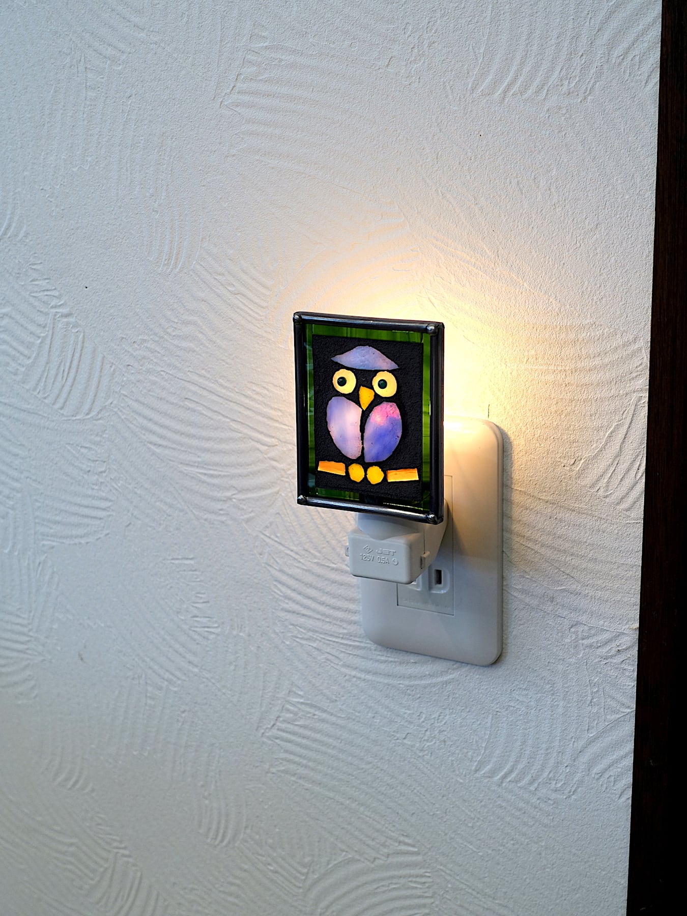 お部屋、廊下などのコンセントに差し込むだけで、ちょっとした灯が足もとを照らしてくれる、ステンドグラスモザイク仕上げのミニランプ。おやすみランプともいいます。吟味したガラスをカットしてわざとまわりを研磨せずそのままモザイク用セメントで固めてあります。そうすることで程よくざらざら感が出るんですね。