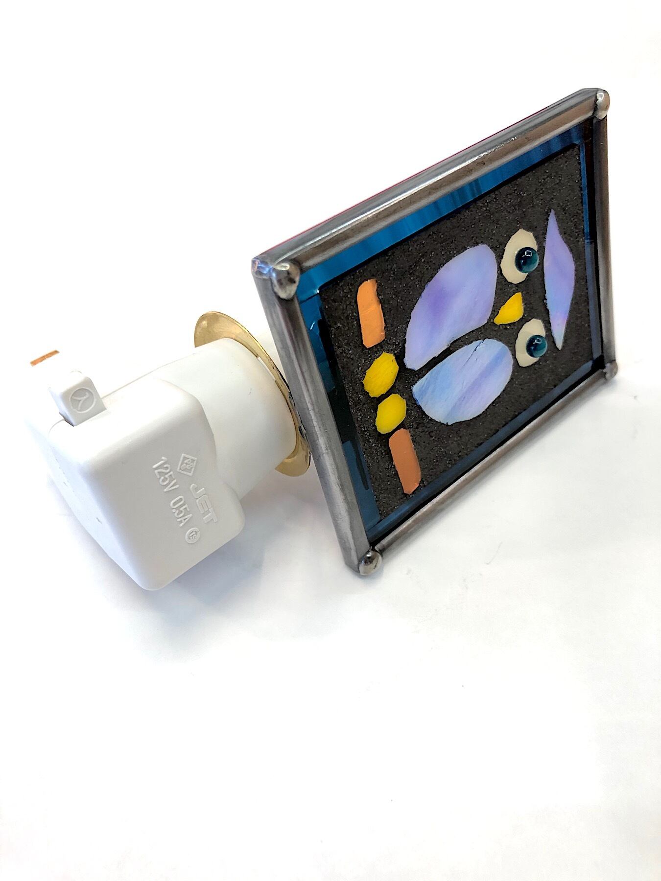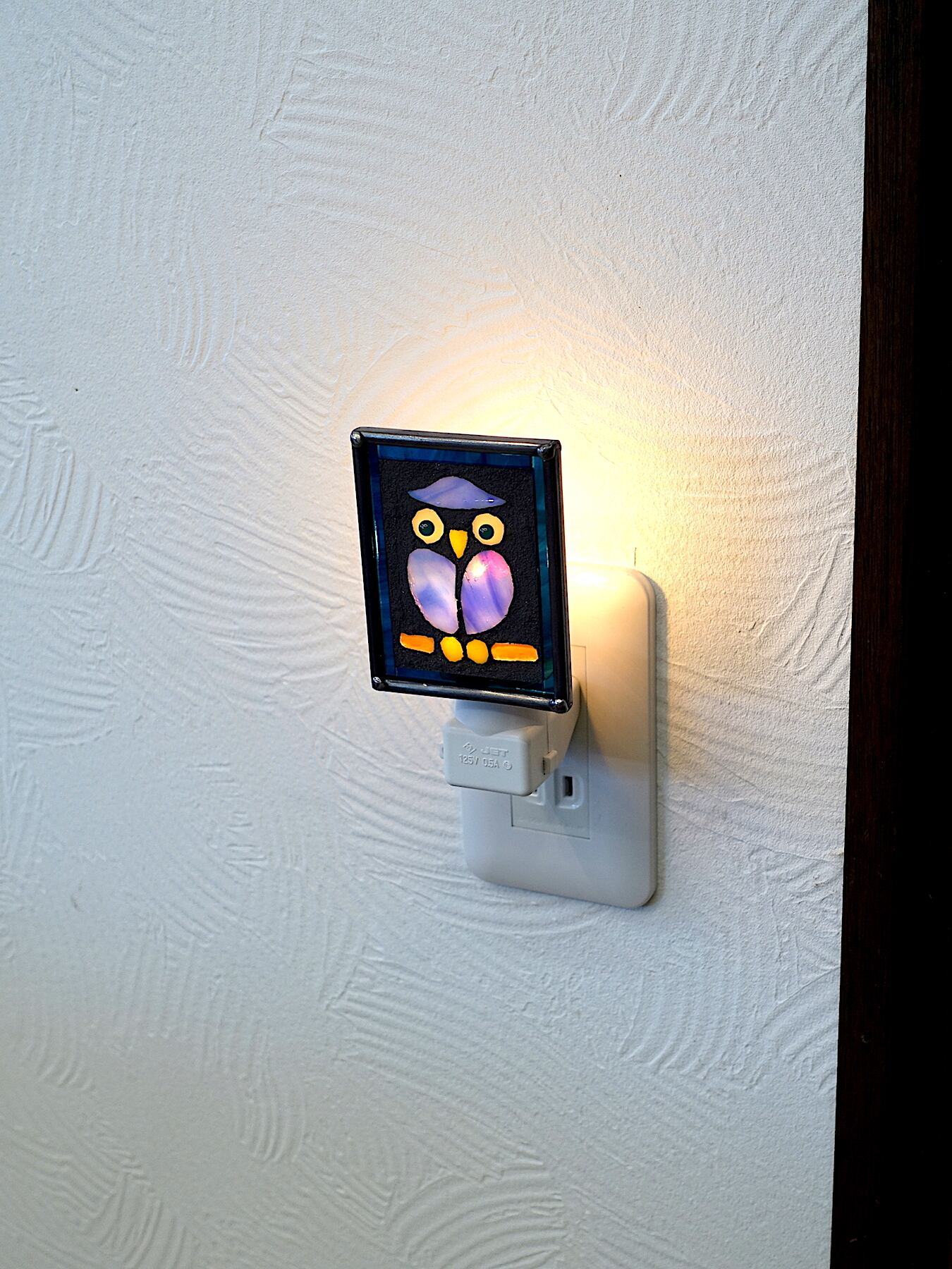 お部屋、廊下などのコンセントに差し込むだけで、ちょっとした灯が足もとを照らしてくれる、ステンドグラスモザイク仕上げのおやすみランプ!! おやすみランプともいいます。吟味したガラスをカットしてわざとまわりを研磨せずそのままモザイク用セメントで固めてあります。そうすることで程よくざらざら感が出るんですね。