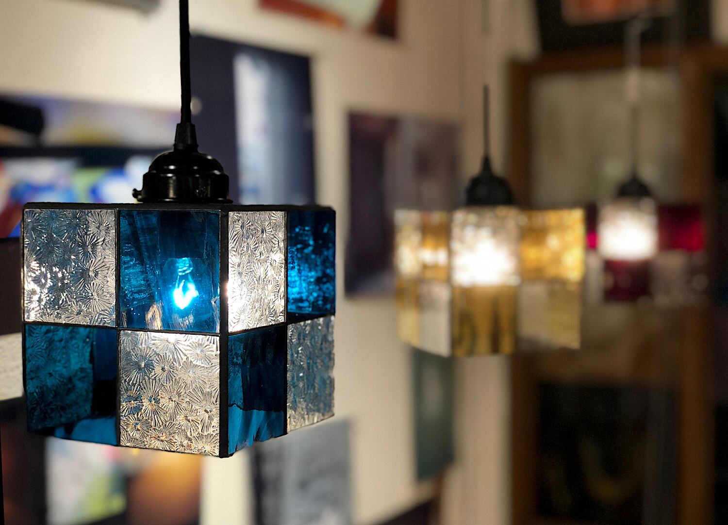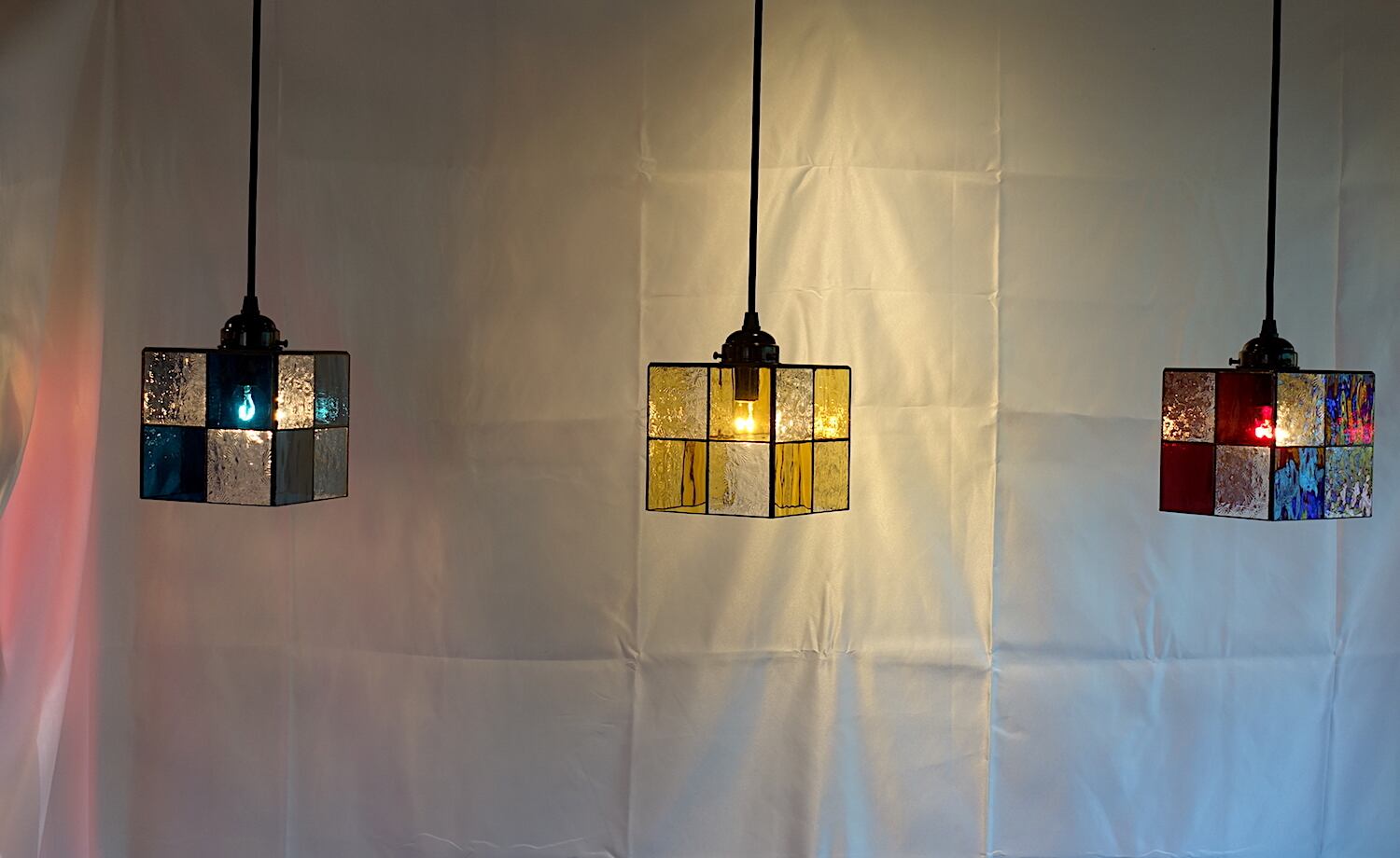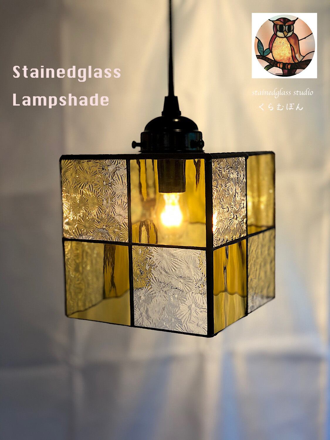 ステンドグラスペンダントライト。水の流れるようなペールアンバーウォーターとフロレンティンクリアガラスの組み合わせ(天板はブラックガラス)。見てるだけで思わず吸い込まれそうな雰囲気があり、癒しの空間を作るのに最適なランプです。色違いで並べてみるのもオススメです。
